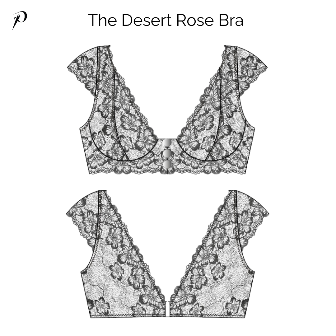 The Desert Rose is a plunge style underwired bra. It includes a two-piece vertical seam cup complimented by cupped sleeves for added support at the shoulders. The lace detail at the back adds the final elegant touch to this unique design.